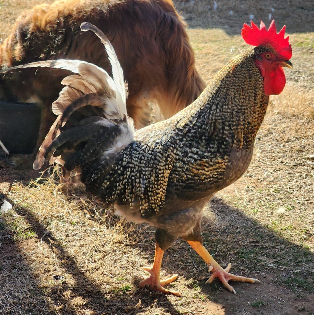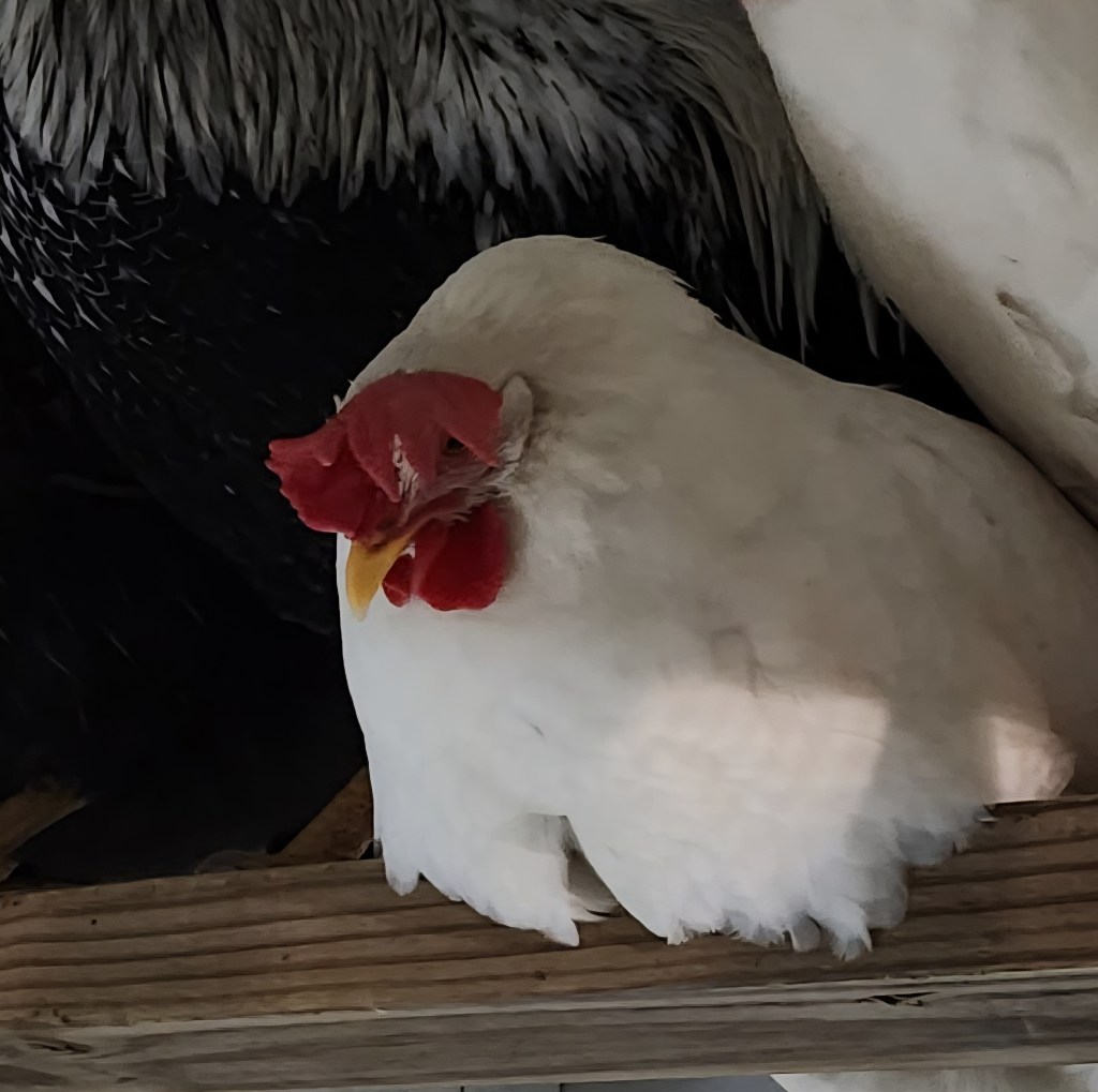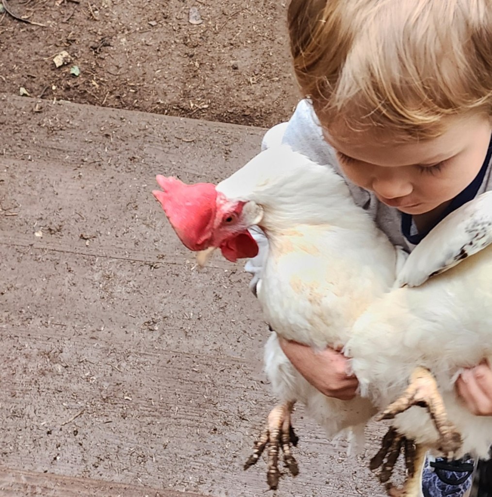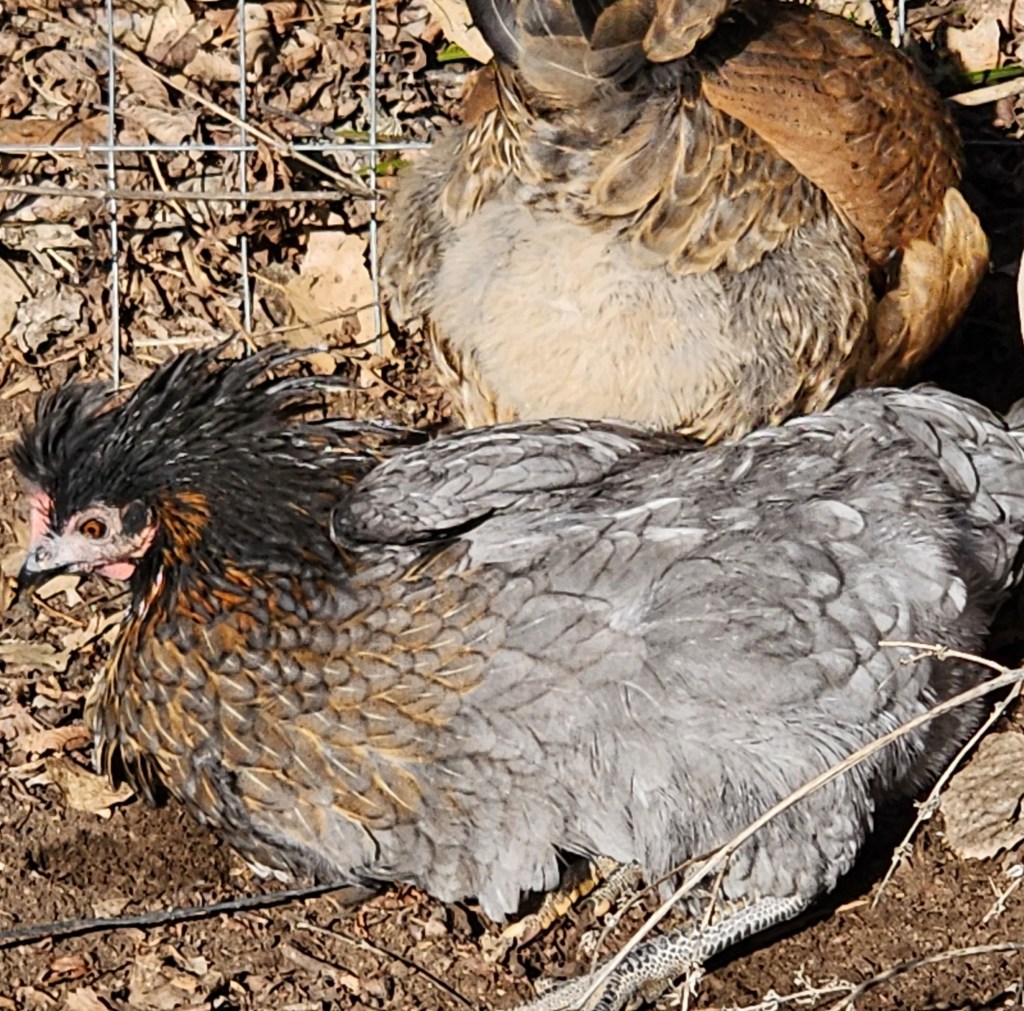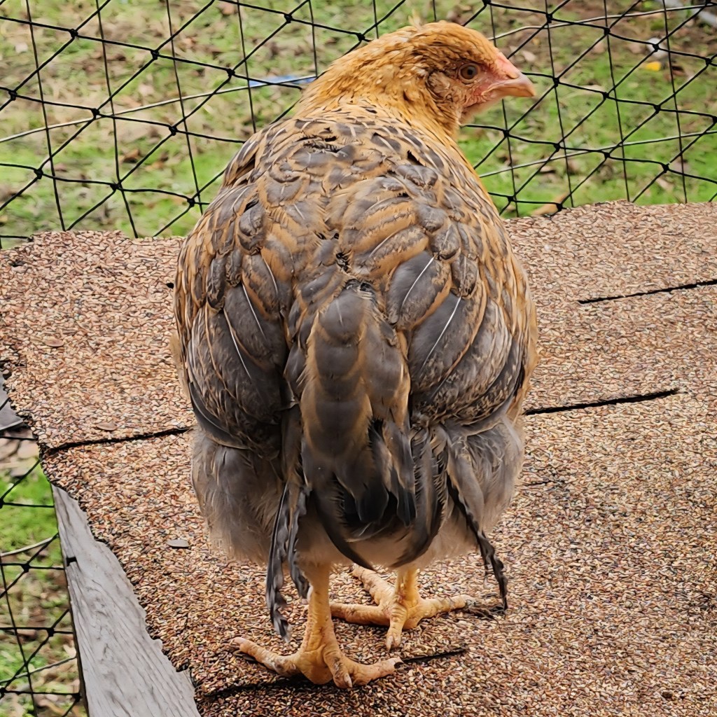 Kahlúa, pictured here (with Dommie’s butt) pretending to be a demon dinosaur, is actually the friendliest of the 3 littles that we hatched here at our homestead. She is a cross of Frederick and Ember.